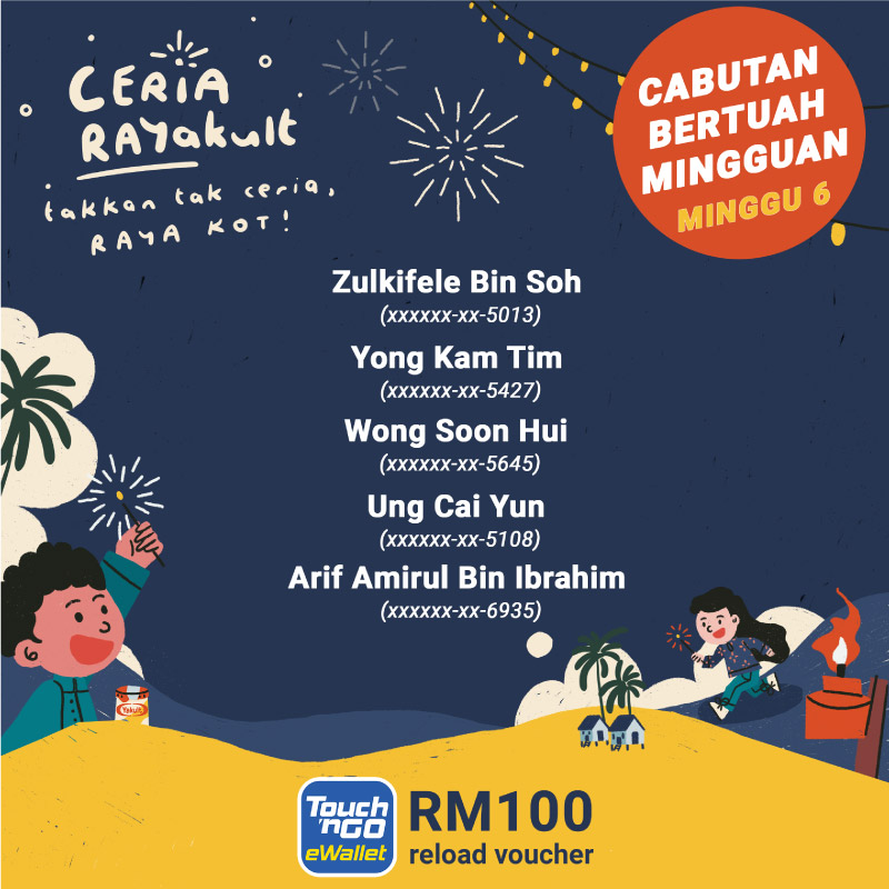 5 × Hadiah Cabutan Bertuah Mingguan – RM100.00 Touch N Go E-wallet reload