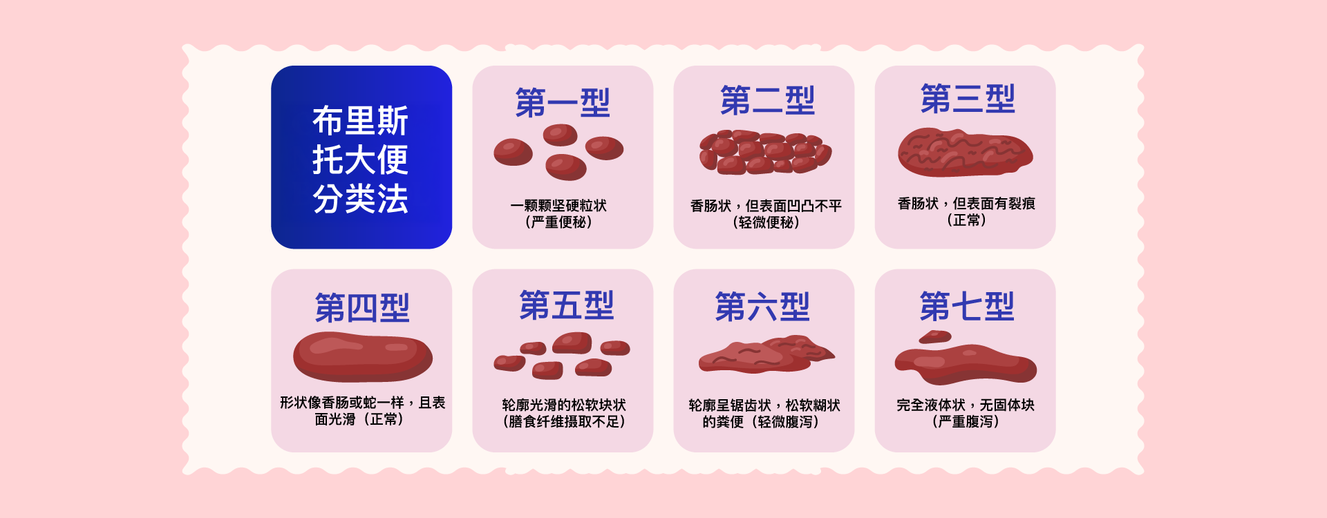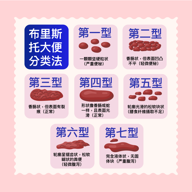 让我们通过布里斯托大便分类法来了解本身的排便情况吧!它用于评估人体排出的粪便形状与质地,并通过第一型(硬便)至第七型(完全液状的稀便)共七个等级分类。正常的粪便一般属于第三或第四型 —— 形状良好,质地适中,不太硬也不太稀,且能够顺畅排出。根据具体情况,您可以采取不同的方法来获得理想的粪便质地。
